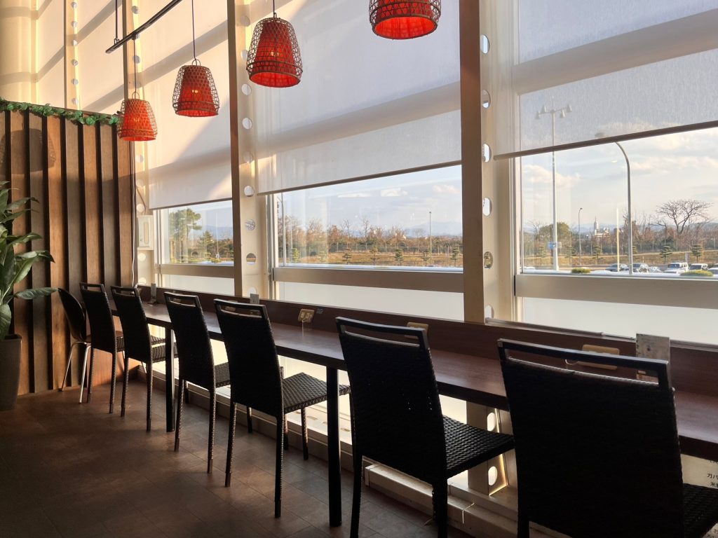 アジアンリゾートを感じられる店内は、4人で使用できる席や窓際にコンセント付きのカウンター席など、様々なお客様に対応できるように席が揃っています。窓からは鳥取の山々を眺めることができ、ゆったりとした時間を過ごせるようになっていますよ。