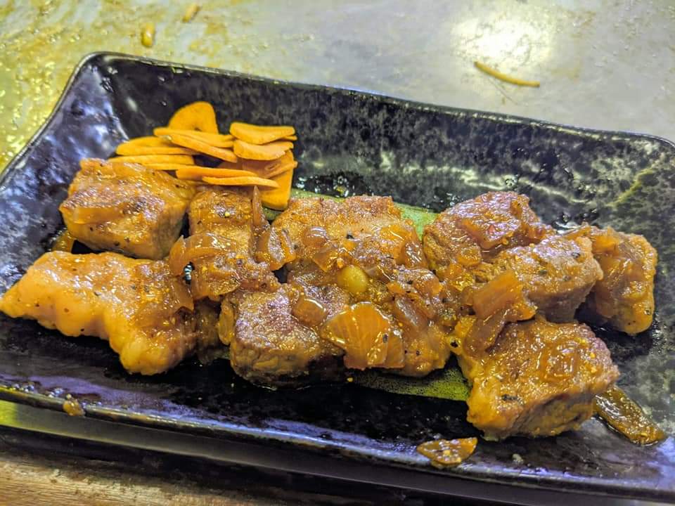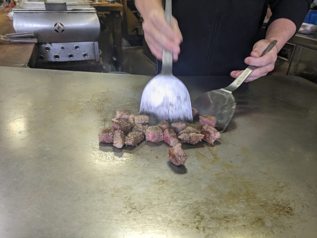 サイコロステーキはシンプルに塩コショウで味付けされていて肉の存在感をしっかり感じられながらも口溶けの良い逸品でした♪にんにくチップと食べると旨みが増して食欲をそそります♪