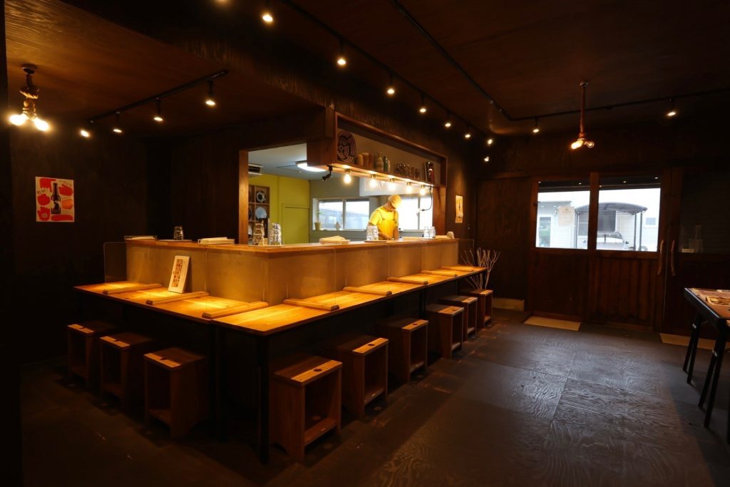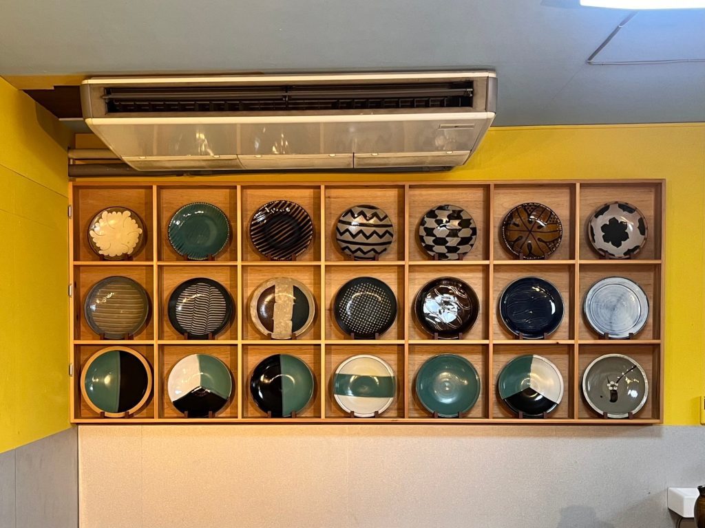 感染症への対策がしっかりと行われ、個別のパーテーションや7台の駐車場の提供など、利便性が充実しています。外観は古いテナントをリノベーションしたおしゃれな雰囲気で、カウンター席の前に立つ厨房では、鳥取が誇る「因州中井窯」や「岩井窯」など、様々な窯元が揃っています。まるで作品展示店のような雰囲気で、見ているだけでも楽しい空間になっていました。