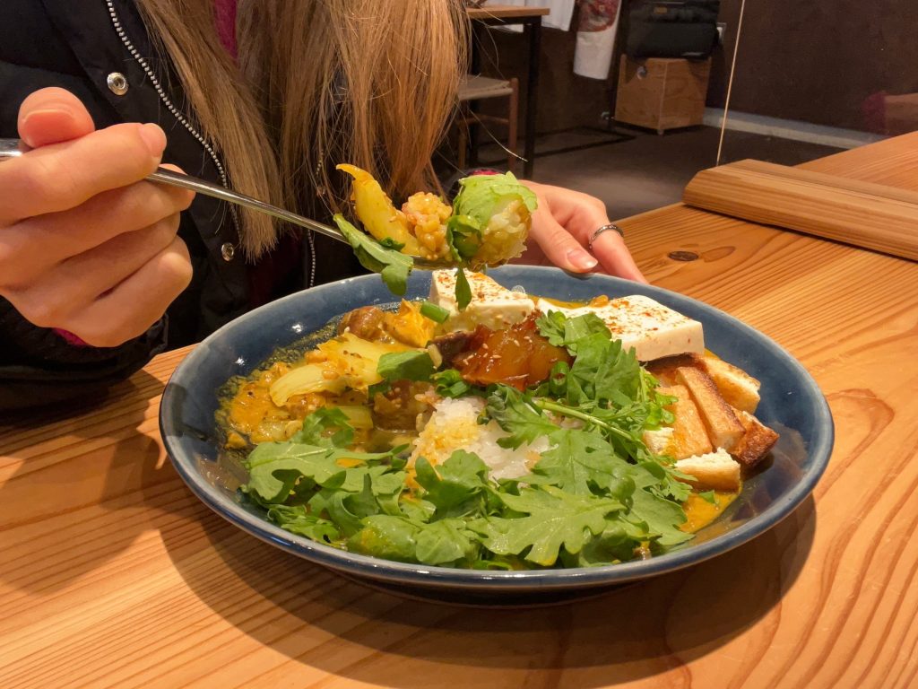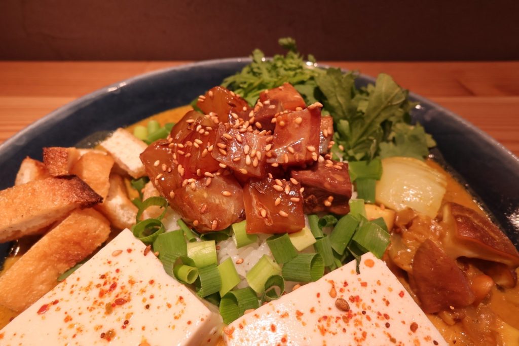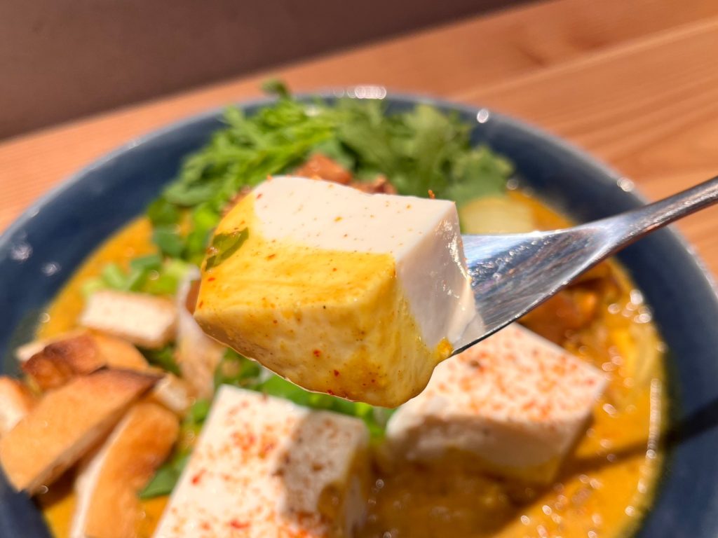 お店では、自分好みのカレーの器を選ぶ楽しさがあり、その上に店主が織りなす美しい盛り付けが特徴的です。まろやかなココナッツベースのカレーに、平尾豆腐店のお豆腐や揚げ、異なる漬け方が施されたタイとブリ、春菊など、多彩な具材が一皿に魅力的に盛り付けられています。数種類の具を混ぜながら食べ、そのたびに味わいが変わり、最後まで飽きずに楽しむことができました。